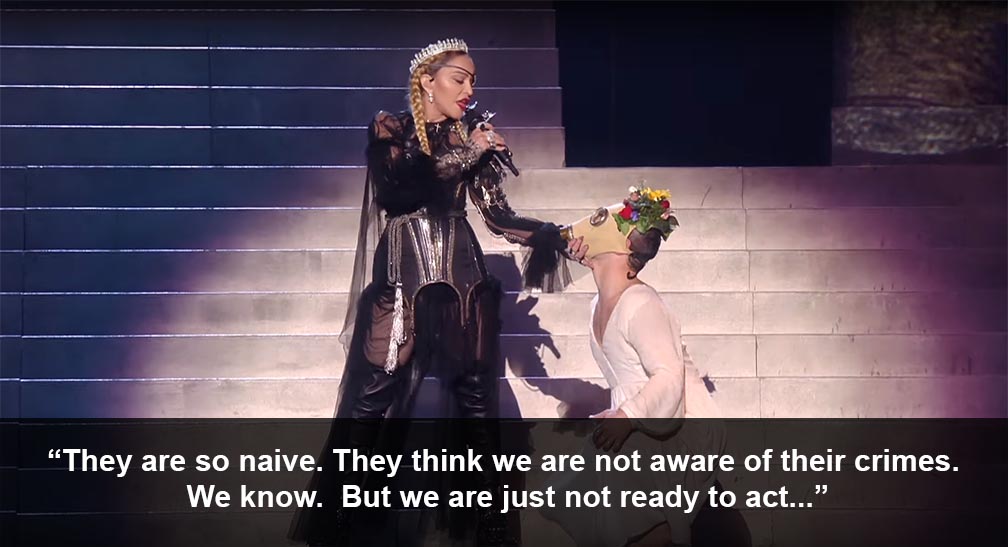 Madonna/Madame X speaking as a representative of an Illuminati considering itself it to be something else than the human race. Gasmask equals gas chamber – the identification with and wearing of the Holocaust myth. Also, crude hint at Ashkenazi physiognomy