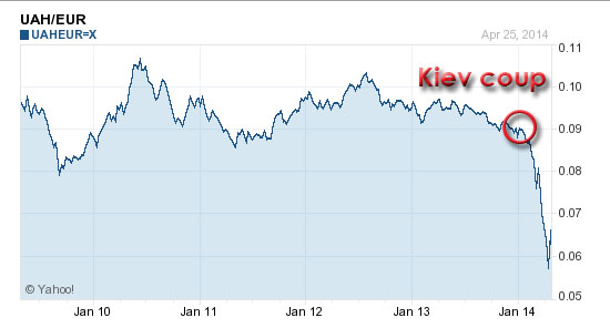 Verkligheten för ordinarie Ukrainare är nämligen att kuppmakarna inte bara fick landets valuta att krascha när de slog till utan också kastade överbord ett avtal med Ryssland som i ett slag gett ett klirr i den ukrainska statskassan på 15 miljarder dollar, utan några krav på moprestationer, samt att gas- och elräkningarna för alla Ukrainare den kommande fem åren kapades med 33%.