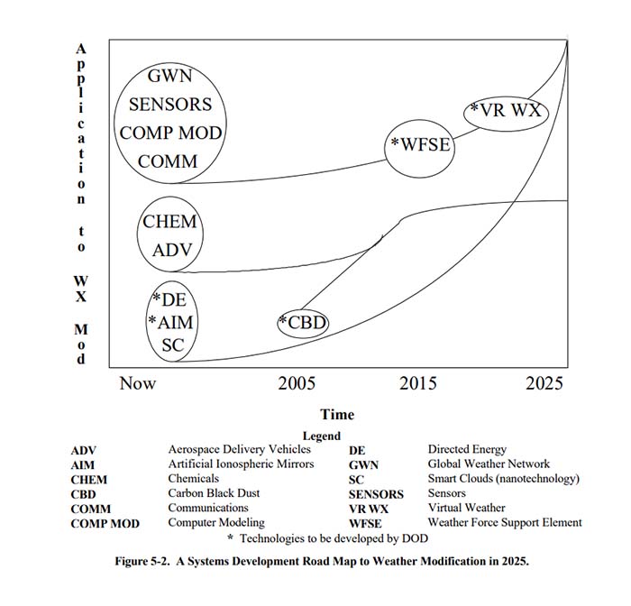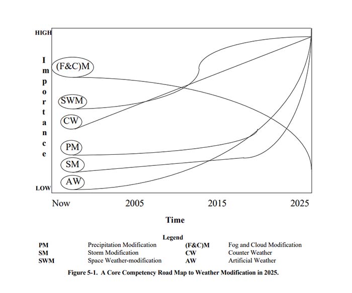 När det amerikanska militärindustriella komplexet öppet publicerade sina planer för lansering av väderkrig (1996, diagrammen nedan) handlar det alltså inte om att skapa en ny teknisk förmåga, utan hur man planerar att rulla ut en förmåga man redan besitter.