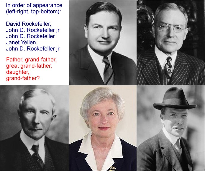 Förutom Janet Yellens judiska påbrå, alltid en hjälp för att navigera Västs etablissemang, så är frågan om Janet:s biologiske pappa faktiskt inte heter David Rockefeller – vilket gör John D. Rockefeller junior till hennes farfar och John D. Rockefeller till hennes farfars far. |
