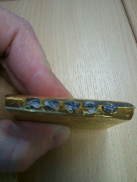 Vad guldhandlaren fann var att tackan borrats ut och guldet i mitten ersatts med den betydligt billigare metallen tungsten, som har samma densitet.