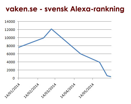 En rimligare svensk Alexa-rankning för Vaken borde alltså vara där den befann sig under vintern – någonstans i tassemarkerna runt 10 000.