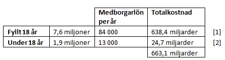 Med denna siffra som avstamp hamnade vår egen kalkyl för kostnaderna för medborgarlön till alla myndiga svenskar (samt bibehållet barnbidrag för alla under 18), på 663 miljarder.