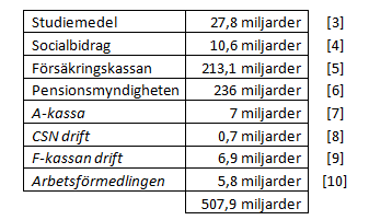 6. http://www.pensionsmyndigheten.se/KortaPensionsfakta.html, 2013-12-02. Pensionssystemet är en alldeles egen liten djungel med inte alldeles uppenbar redovisning av sina siffror. För att förenkla användes utbetalda inkomstpensioner om 236 mdr som schablon.