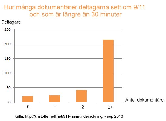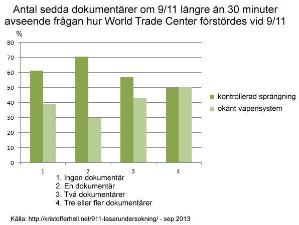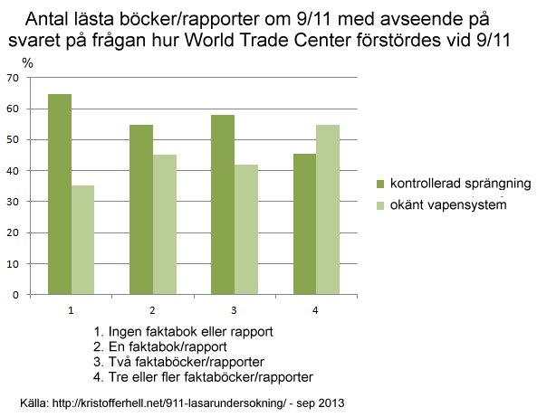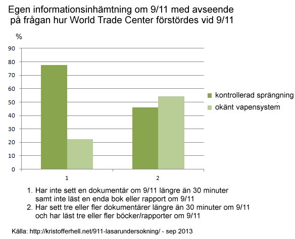 - Ett anmärkningsvärt starkt stöd för hypotesen kontrollerad sprängning återfinns bland 9/11-skeptiker som inte läst någon faktabok/rapport överhuvudtaget och som inte heller sett någon 9/11-dokumentär längre än 30 minuter.