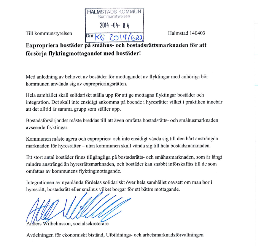 Socialtjänsten i Halmstad – expropriera privatbostäder ge till flyktingar