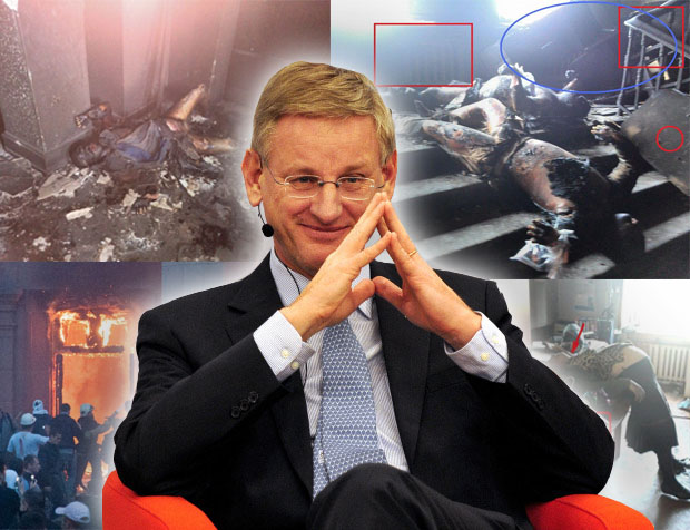 Kort därefter, hösten 2013, sjösätter vår tids ondska aktioner i Ukrainas huvudstad Kiev – händelser som i februari 2014 ledder till en neofascistisk statskupp som i dag förvandlats till ett inbördeskrig där imperiets lokalt svagt förankrade neofascister med stöd av NATO och EU och Carl Bildt från Sverige nu skickat amerikanska, danska, svenska och arabiska legoknektar och spioner att ägna sig åt sådana övergrepp på civilbefolkningen att Sverige i dag kan stoltsera med en krigsförbrytare i viktklassen “satans mördare” – ett begrep en gång myntat av en svensk statsminister.