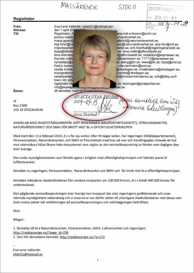 Den pågående aerosolbesprutningen över Sverige kan knappast ske utan regeringens godkännande och ovan nämnda myndigheters inblandning och vi reserverar oss därför rätten till ytterligare skadeståndskrav mot dessa men även andra parter när omfattningen på aerosolbesprutningen och mörkläggningen bekräftats.